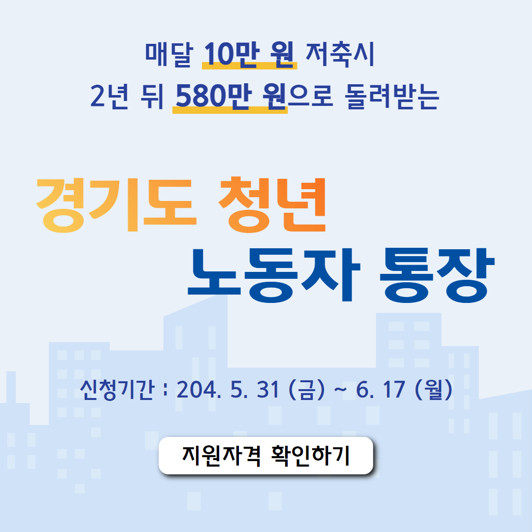 경기도에서 청년들의 노동의지와 취업의지를 고취시키고 금융역량을 강화하시키고, 미래에 대응력을 키우게 하고자 매달 10만원 저축 시 2년 후 580만원을 적립해주는 노동자 통장 신청자 모집기간입니다.